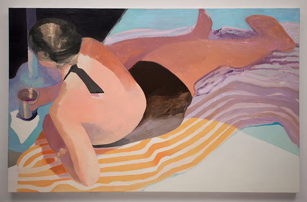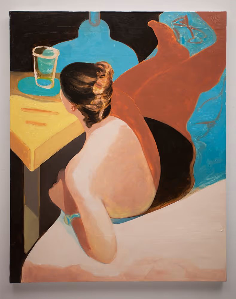 While embracing the idealism of formalism and acknowledging that a large part of her work is about historical relationships in painting, Delphine remains grounded in her approach to painting as a narrative that begs to be staged. In her paintings the human presence is a trope. The bather a template for the ubiquitous reclining figure. Signifiers of the passage of time are the empty or full wine glasses or plastic cups present throughout the paintings, both symbols of the luxury and ease elemental to pool side culture. The bather in the throes of spending time leisurely portrays a narrative that stands in juxtaposition to the visible side affect of time. An image depicting distilled motion, or the act of relaxing, contemplation and absorption of the suns rays. A mere acknowledgement of what it means to be alive? Or; Bathing; an aspect of our existence linked into our deepest instincts for survival.