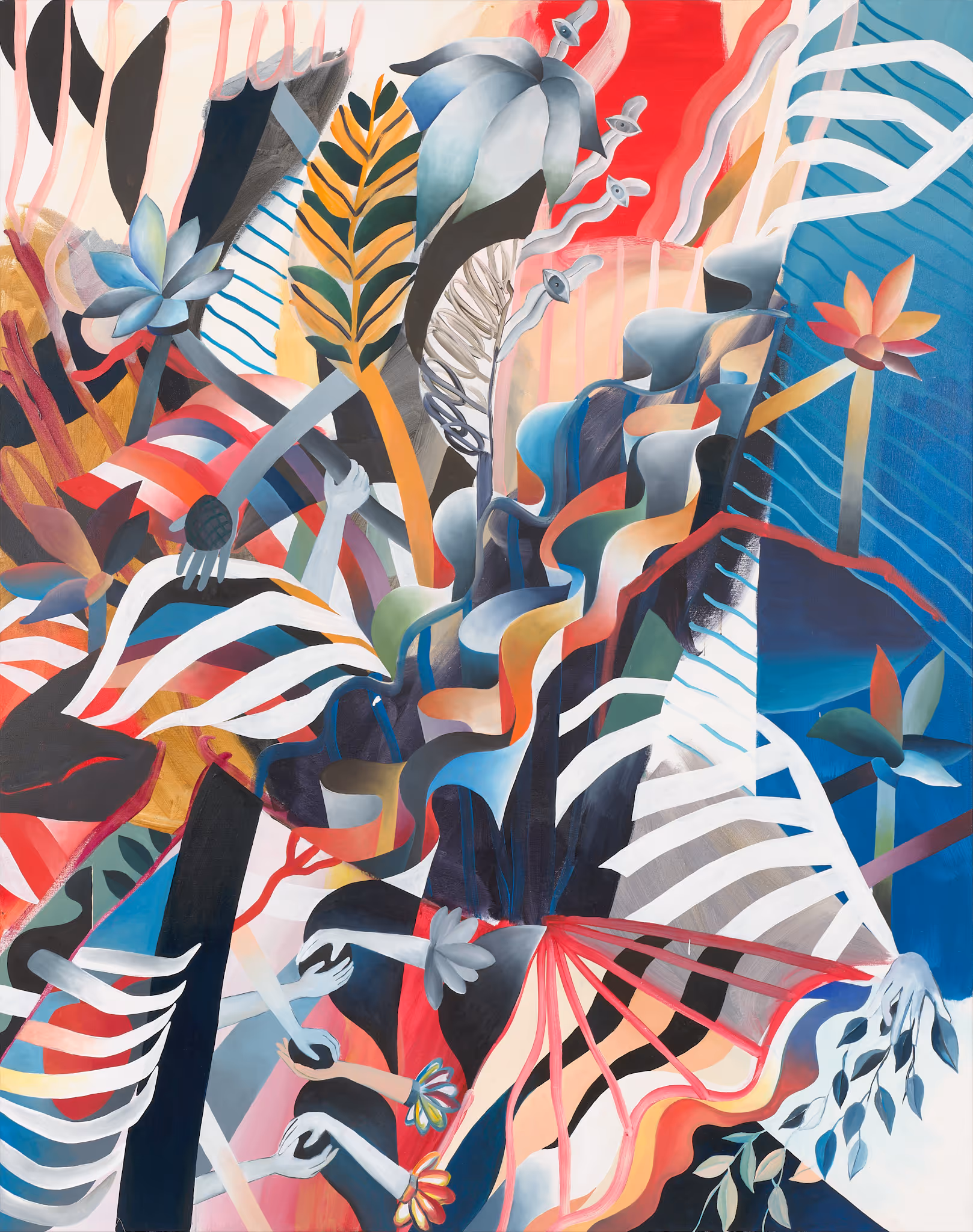 Gabriela Těthalová’s paintings are a mixture of many intertwining plans and permeable surfaces, organic shapes and undulating lines, bringing dynamics and an imaginary relationship to irregularity and unpredictability into the paintings in sharp contrast to the continuously reflected theme of repetition. Rigorous work with geometric shapes and a bold colour palette is combined with rapid gestural strokes that can evoke automatic or childlike painting. It is the combination of these elements that brings playfulness to the canvases, contrasted with a degree of restlessness of viewer‘s gaze flowing and trying to see the painting through all its layers. The composition, however, is broken up into many interlocking and overlapping surfaces that disrupt the ability to orient oneself in space.