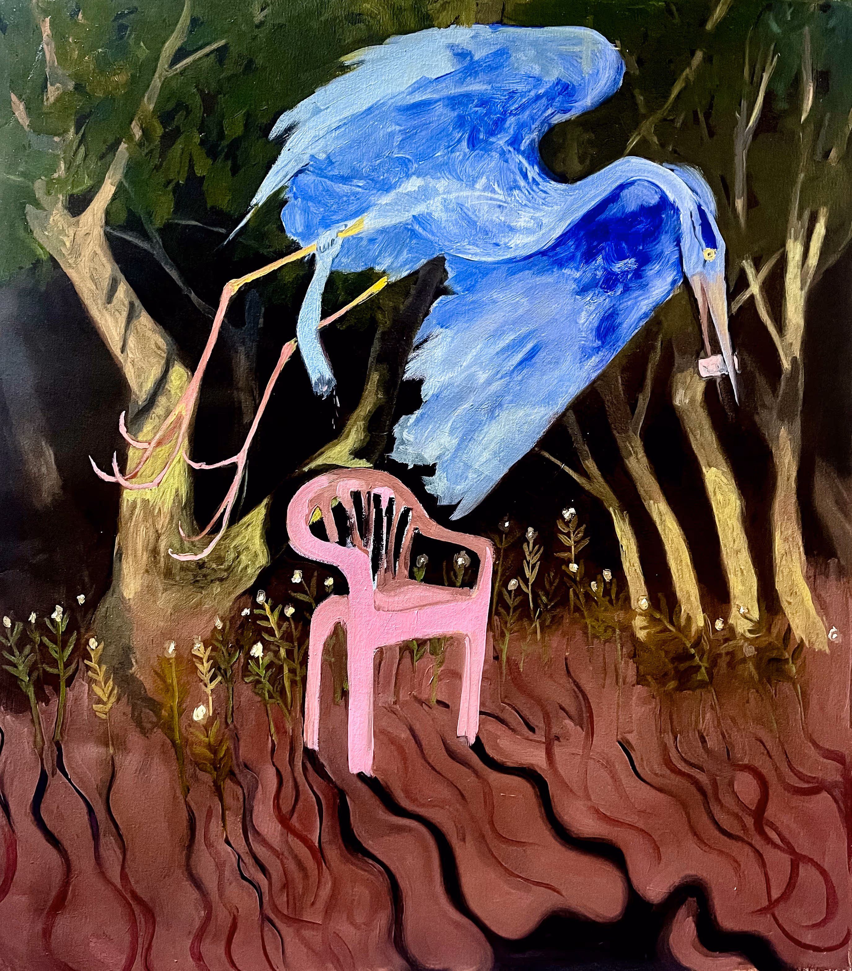 Hannah Hill’s paintings fantasize about an alternative world. An internal plane made physical - Residual traumas made poetic - imagined worlds colliding with the historic. Paintings act as spells to express what did happen, what we wish had happened, and where it all intersects with a historical and ecological context. Using oil on large canvases, Hill sets up worlds inspired by the biome of the ever changing Deep South. Within them, female figures act as stand ins for desires and failures that are never expressly personal nor societal, as they fight off invasive species while invading the space themselves. Her images spring from personal experience as well as curiosities; archaeological finds, folklore, ecologies, ancient societies, medieval manuscripts etc. This sprawling research, combined with a life lived as a woman in the Appalachian foothills, a penchant for self reflection and an unusually religious upbringing in the foothills of Appalachia, casts strange imagery of feminine presence, landscape, fauna, flora and relic. This result is a forged personal mythology, where elements of the ‘real’ world and the supernatural are intertwined.