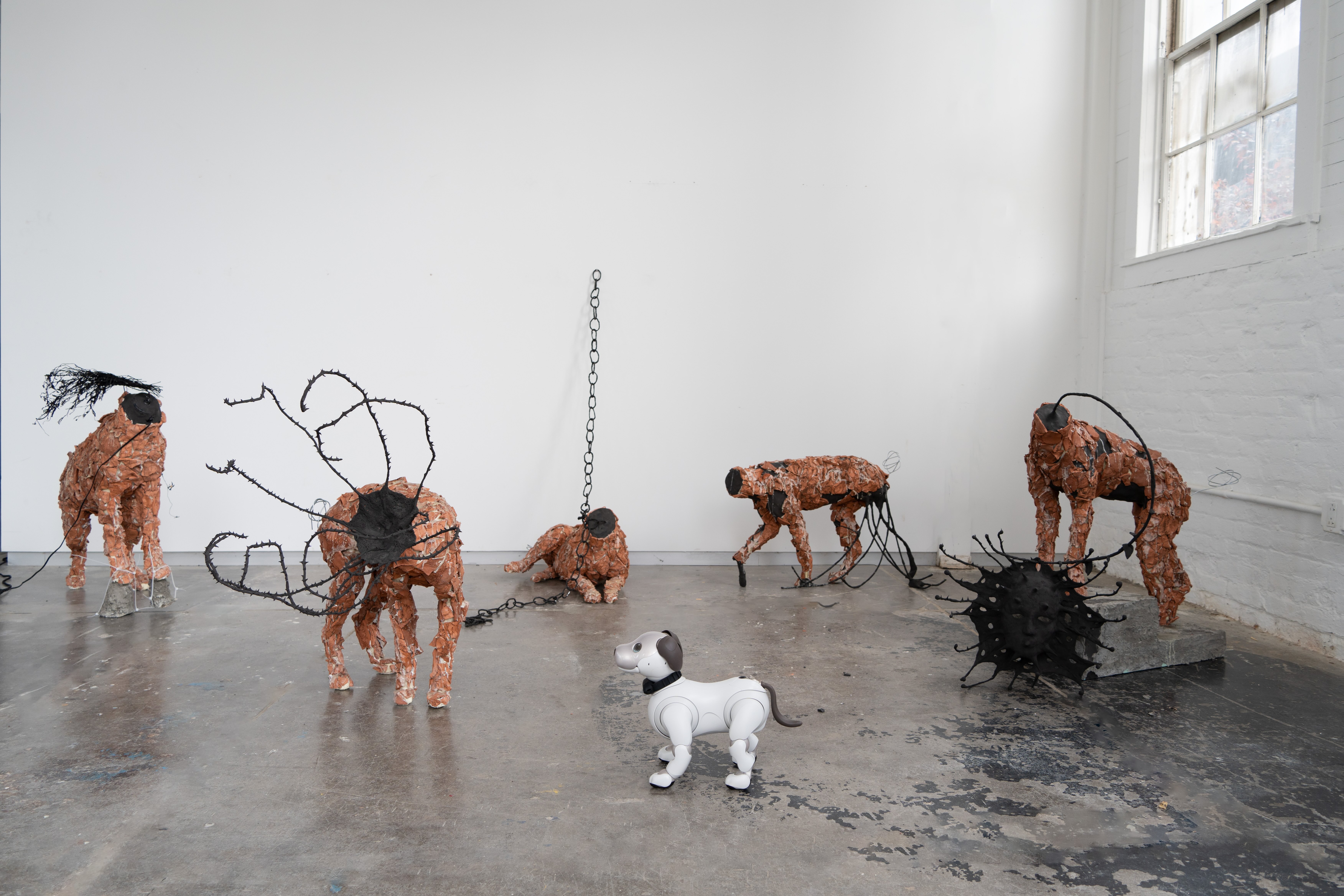 Hyunjin Park creates scenes where imaginary animals and AI companions coexist. Through sculpture, installation, performance, and video, she explores how care, kinship, and belonging shift across changing boundaries. Her visions grow from intersecting histories of migration: her late poodle's journey from life to death, an AI robot dog's travel from Japan to America, and her own passage from East to West. Through these shared experiences of crossing and settlement, Park became interested in how dogs—like migrants—navigate complex cultural positions. They exist as beloved companions yet simultaneously become subjects of derogatory language targeting both animals and women. Working with organic and mechanical materials, she creates hybrid sculptures and installations that blur boundaries between living and artificial, life and death, and the modern and ancient.