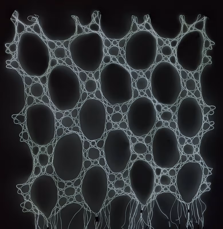 Klinger’s work interweaves installation work with textiles and physical computing. The focus of her practice is redefining the boundaries of the body, space and garments as queer abstraction. Combining traditional fiber techniques with light and interaction, she explores how the space affects the body and how the body affects the space. By employing a feminized craft, bobbin lace, Klinger examines how centuries old lace patterns can be used to create immersive environments. Meshing together electricity and lace, she creates lace environments and sculptures using electroluminescent wire - a light emitting bendable material. Through the use of sensors, Klinger codes and codifies her works into living light emitting lace bodies, in dialogue with our own bodies of flesh.