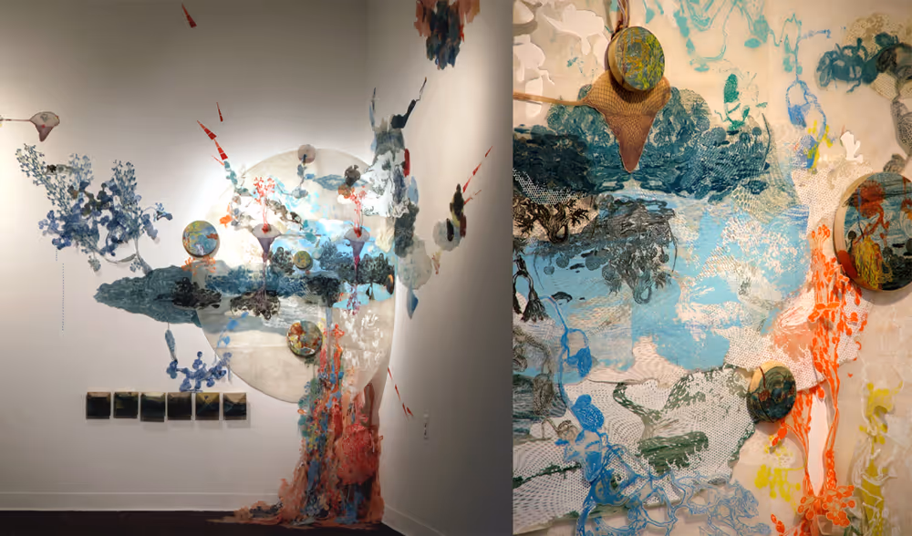 Through this presentation, Goh becomes the extension of nature and nature becomes the extension of his body. Goh's images evolve from biological forms to landscape, describing the interaction between the inner and outer mass of human body. In the process of folding, cutting, flipping and overlapping printed materials, images are gradually transformed away from identifiable objects, taking on a naturalistic guise of their own, growing into space, posing questions about our accepted definition of printed works of art, as well as the idea of passage.