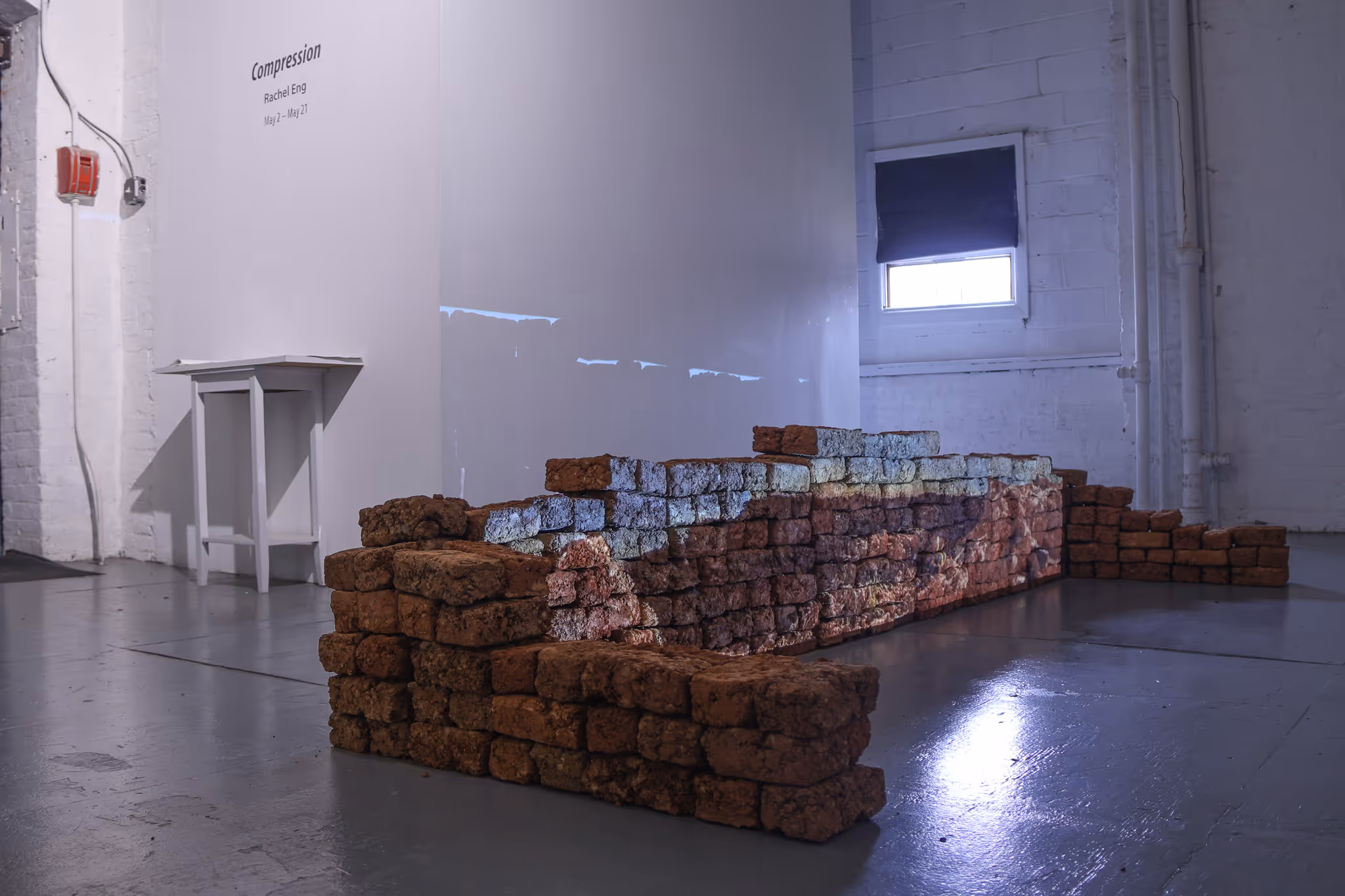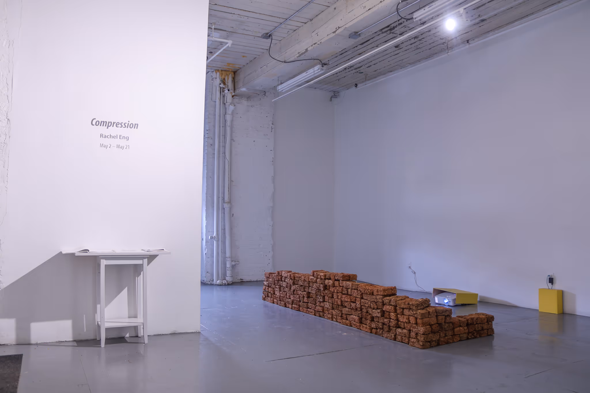 NARS Foundation is pleased to present Compression, a solo exhibition by Rachel Eng. Compression is an installation of hand pressed bricks made from clay local to Cumberland County, PA, video projection, and sound. Initial project themes have been related to land use, natural and built systems, and regeneration. Questions of where our materials come from, where they travel and their subsequent impacts are central in this. Bringing a rural site, to an urban city.