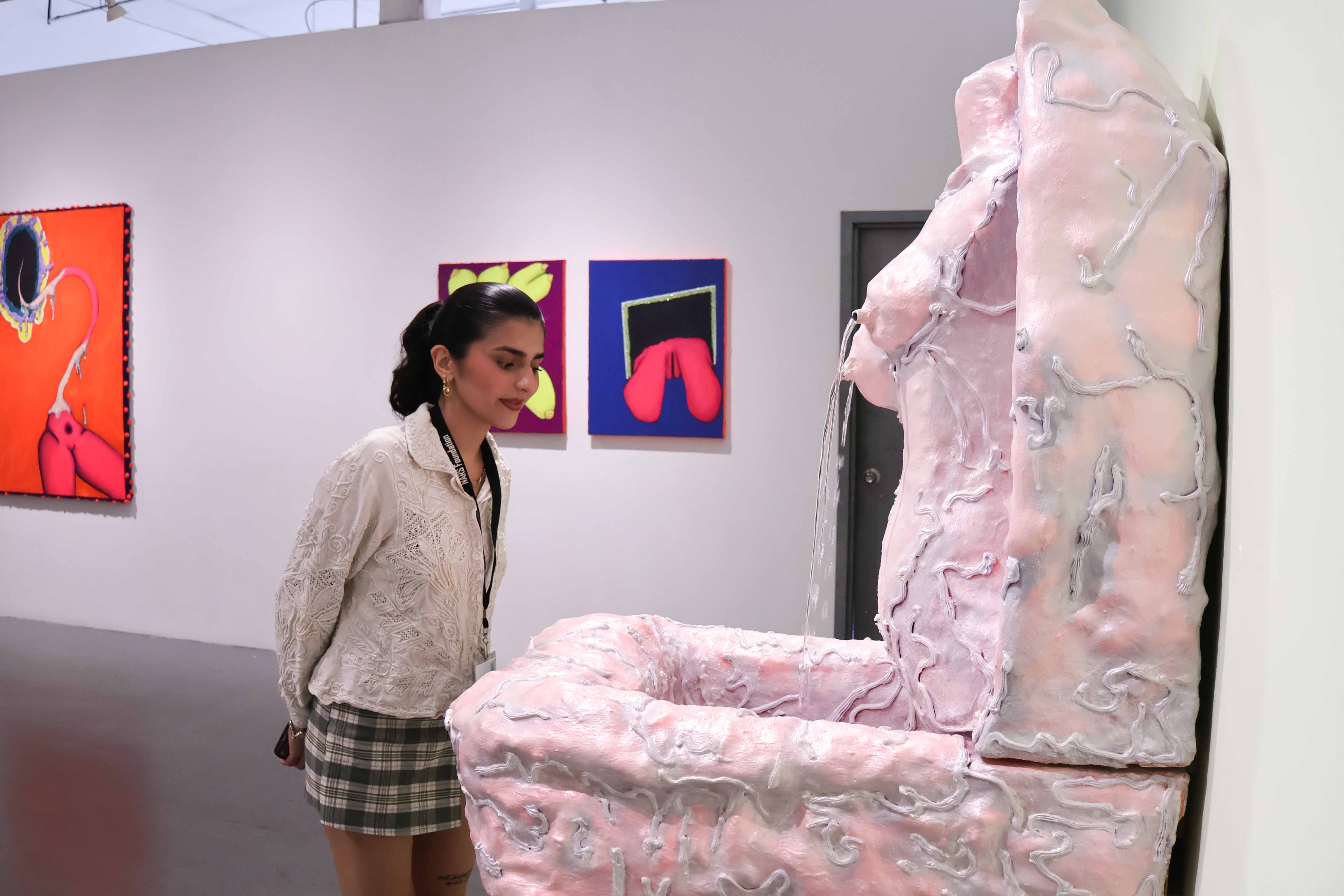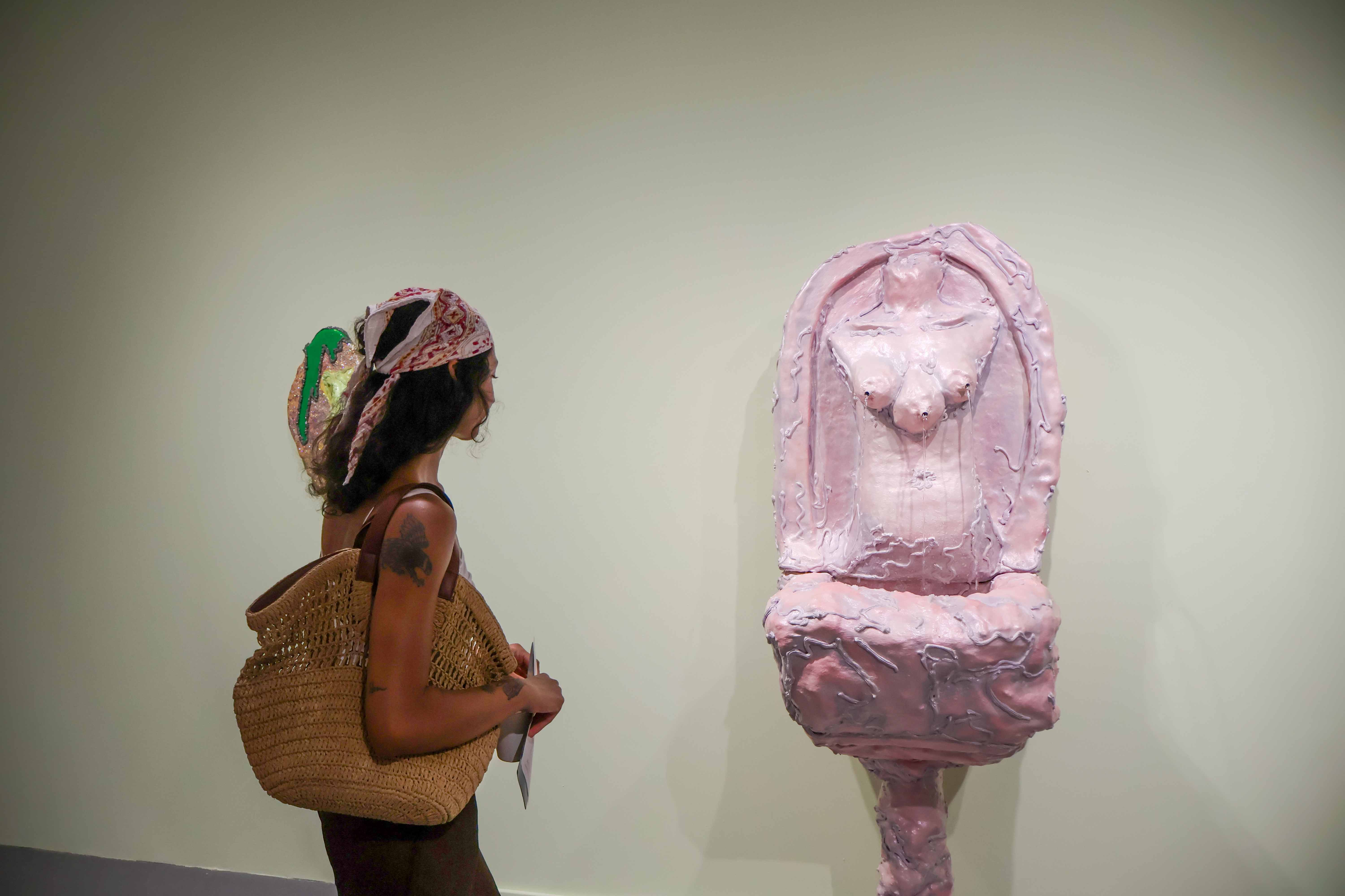 Devastating presents a solo exhibition of new paintings and sculptures by the artist Judy Giera. Known for her mixed-media, theatrical and textured works, Giera’s latest paintings and sculptures present flesh as fragmented and malleable, rendering new forms as old as time: fluorescent breasts, thighs, and vaginas vibrate, shimmer, and drip, emerging from deep recesses. Pleasure, sustenance, horror, and beauty intertwine in Giera’s fantastic, feminine figures. In recent sculptures, mirrors, vanities, and fountains are refigured in fiberglass to new heights. These portals for reflection and narcissistic beauty not only emerge as self-portraits, but, by virtue of their former functionality, demand a reorientation of one’s own body when encountering them. The artist thus offers new corporeal orders, requesting that we indulge ourselves in her world of continuous adaptation.