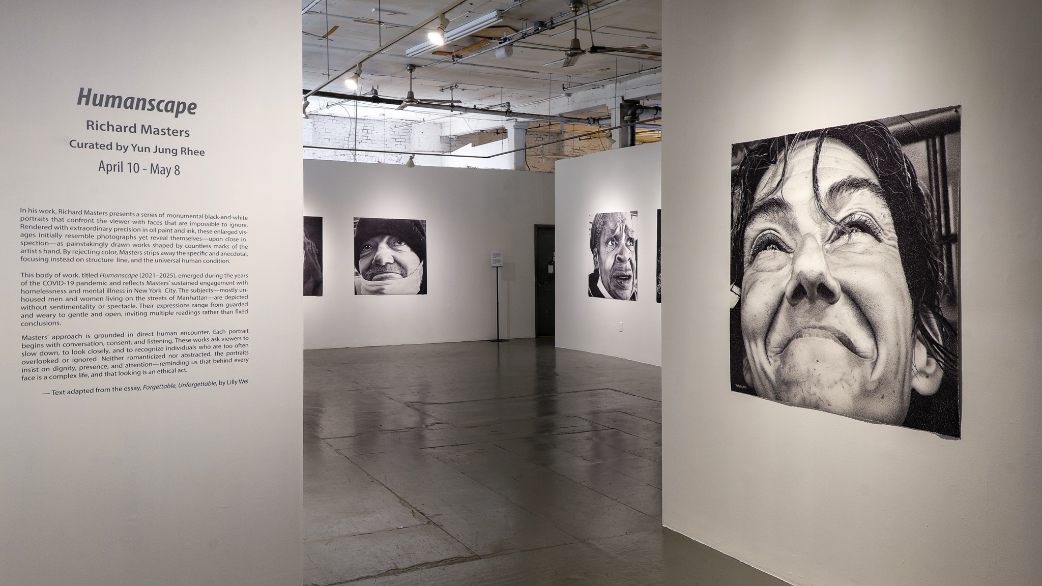 Richard Masters is a visual artist based in New York, whose work explores portraiture, urban expe-rience, and social visibility through painstakingly detailed drawing and painting practices. Working primarily in black and white, Masters combines oil-based paint and ink to create large-scale por-traits that blur the boundaries between drawing, painting, and documentary image-making. His work is rooted in sustained observation and direct human encounter, emphasizing empathy, pres-ence, and lived experience. More information and selected works from HUMANSCAPE may be viewed at: https://richardalanmasters.com/portfolio/.